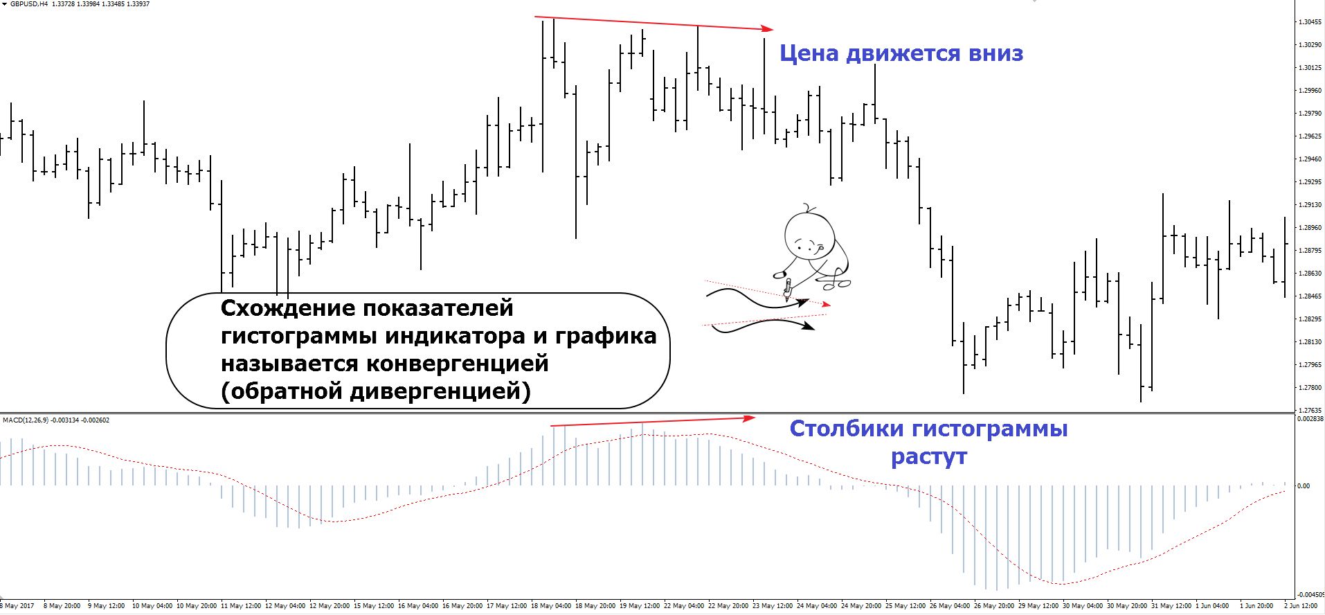 Конвергенция — это противоположность дивергенции. То есть ситуация, в которой график цены и кривая индикатора сходятся. Например, цена понижается, а график индикатора растёт, и визуально видно их сближение.