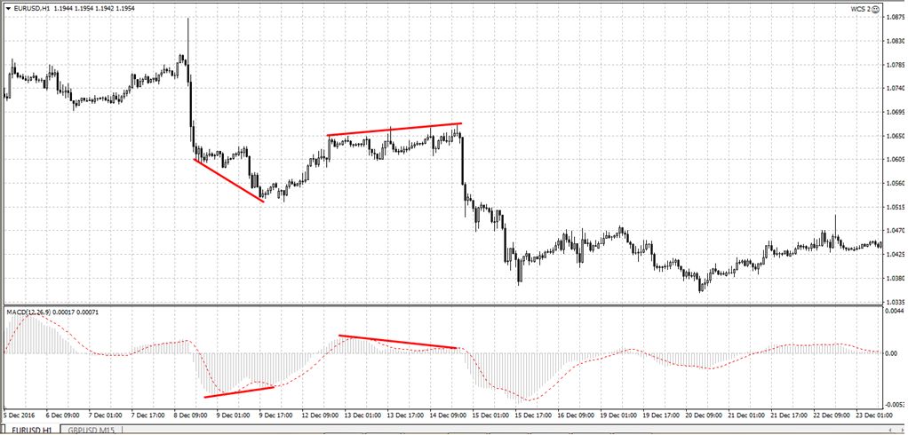 На скриншоте мы видим два примера дивергенции с использованием индикатора MACD на часовом таймфрейме валютной пары EUR/USD.