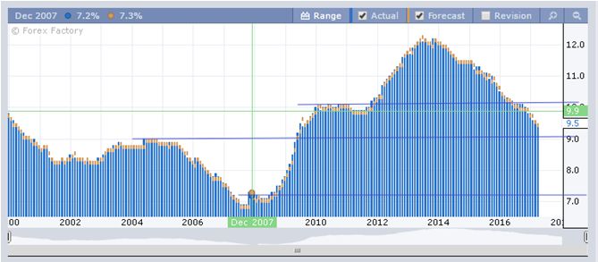После кризиса 2008 г. наблюдалось достаточно долгое восстановление вплоть до 2014 г. Сейчас уже Еврозона выходит на более-менее стабильные цифры прироста рабочих мест в районе 0,3 % ежеквартально.