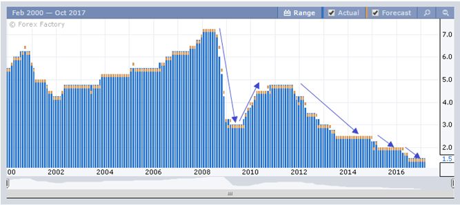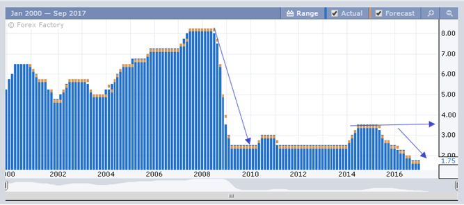 Сильный скачок данных по CPI заставил пересмотреть ставку в пользу повышения, однако после 2015 г., власти видя низкие инфляционные значения, вернулись к экономике стимулирования.