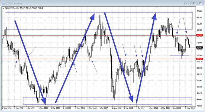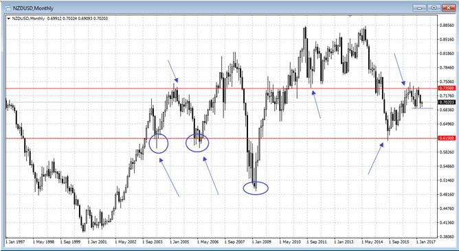 Глобально, новозеландский доллар находится в широком диапазоне с 1996 года от 44 до 94. Сейчас в локальном диапазоне от 69 до 83.