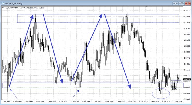 Глобально, инструмент с 1996 года находится в широком рейндже между 1,04500 и 1,36. В 2014 году вслед за повышением процентной ставки новозеландский доллар обновил минимумы, но продолжения не последовало. Ложный пробой нижней границы и возврат в рейндж вполне может восстановить глобальную тенденцию от 1,04 до 1,36.