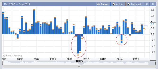 Что касается ВВП Австралии, то ситуация достаточно уникальна. По статистике видно, что экономика в меньшей степени зависит от внешнемирового фона, восстановившись уже до своих средних значений с 2000 г. по 2008 г.