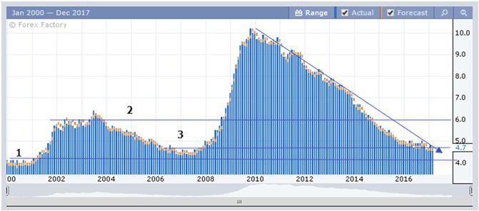 Тенденция позитивная к снижению уровня безработицы как в США, так и по Еврозоне. Однако, если внимательно посмотреть на график, то видно, что ситуация в Америке уже начала улучшаться в 2010 году, в то время как безработица в Европе росла вплоть до 2014 года.