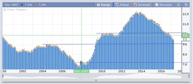 Европе же, еще далеко до своих минимальных значений. Уровень безработицы все еще достаточно высокий и, вероятнее всего, спешить с поднятием процентных ставок никто не будет в достаточно хрупкой ситуации.