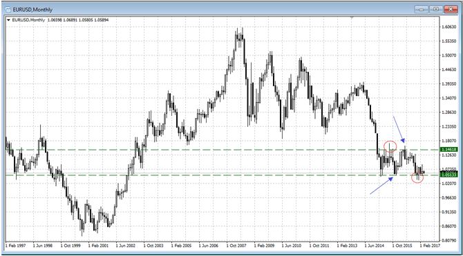 С технической точки зрения цена находится в диапазоне между 1,146 и 1,051. Попытка пробить в 2015 году диапазон вверх закончилась ложным пробоем и движением до 1,05133.