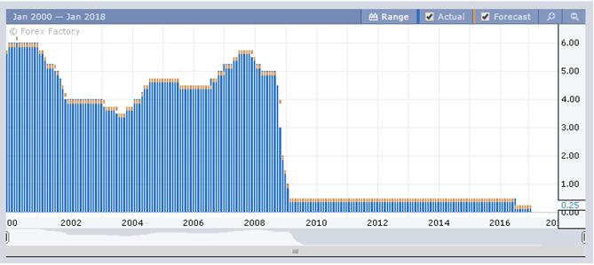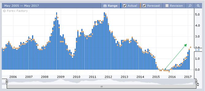 Из графика видно, что с 2012 года динамика потребительских цен резко снизилась, реализовав дефляционные ожидания. В свою очередь, чтобы смягчить последствия Брексит, Банк Великобритании снизил в 2016 году учетную ставку до 0.25 %, что в свою очередь поддержало CPI на протяжении года до 2 %.