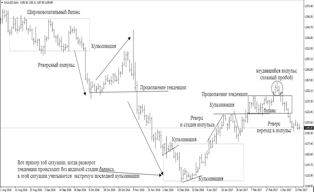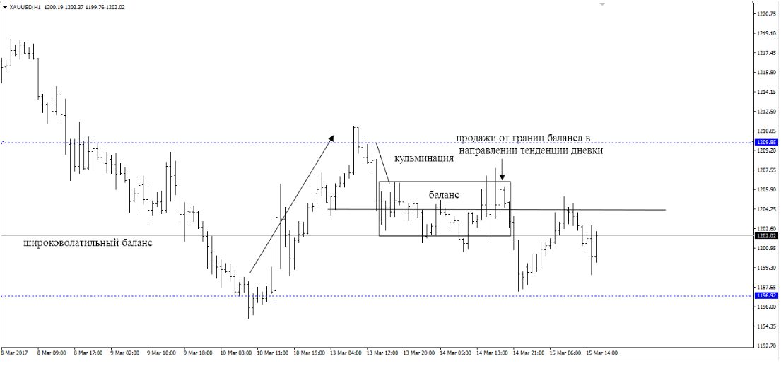 • Если после кульминации возникает стадия баланса и пробой с закреплением в сторону, противоположную тенденции, тогда работаем в направлении слома тенденции.