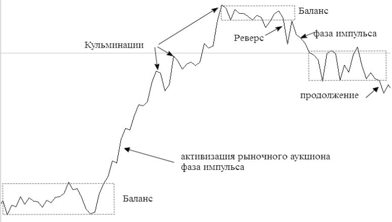 При выходе из баланса спроса и предложения по какой-либо причине (нехватка ликвидности, законченный набор позиции и ее реализация) начинается рыночный аукцион, сильное движение. Другое его название импульс или дисбаланс.