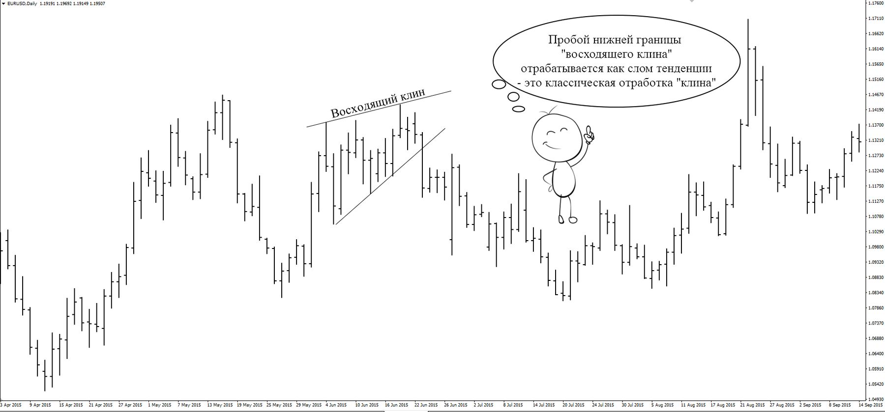 Для примера рассмотрим ситуацию с восходящей фигурой клина в техническом анализе.