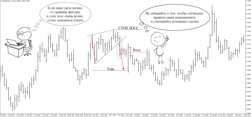 Когда идентифицирован паттерн «Клин» нам нужно знать, при каких обстоятельствах открывать позицию, где устанавливать стоп-лосс и как определить потенциал движения цены после выхода за границы модели.