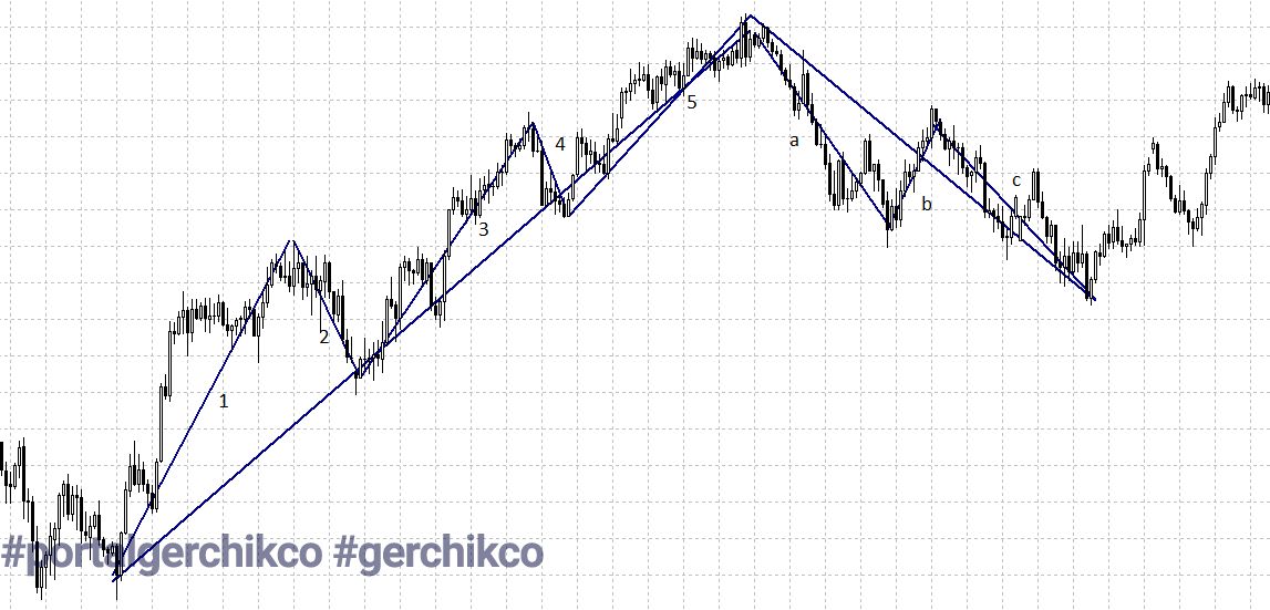В результате мы получаем полный волновой цикл, состоящий из 8 волн. Из них 5 импульсных, где 1, 3 и 5 волна направленных в сторону основного тренда, а 2 и 4 – коррекционные. Три коррекционные, где волна «a» и «c», направленные в обратную сторону, а волна «b» - в сторону основного тренда.