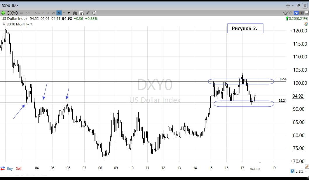 Так предыдущий месяц индекс доллара закрывает в ключевом дневном уровне, за который была достаточно длительная борьба, выходит выше 92.70 - 94 и закрепляется в диапазоне на месячном графике 92.2 - 100.