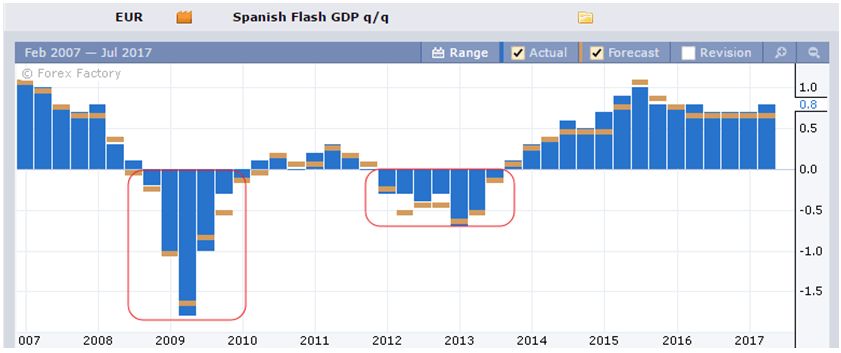 Например, кризис 2008 года сказался на ВВП Италии в снижении -2.5 %, по Испании чуть больше -1.5 %. Период 2012 - 2014 годы в Италии прошел ежеквартальным снижением порядка -0.8 %, по Испании - в районе -0.5 %.