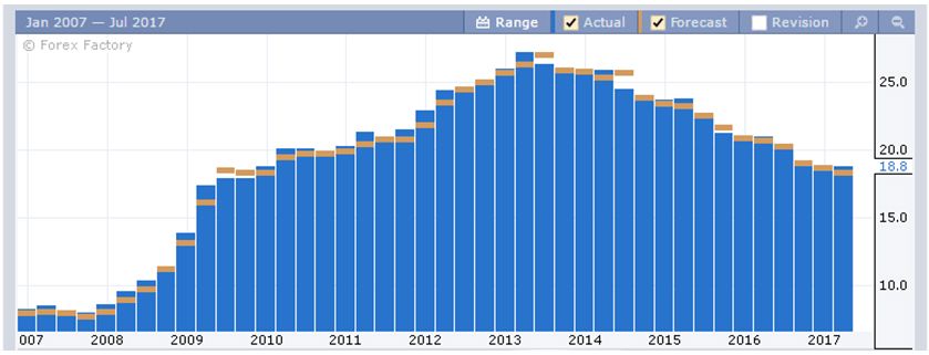 Также, как и в Италии, кризисный 2008 год и продолжение публикации негативных данных на протяжении с 2012 до 2014 годов. Но, в отличие от Италии, цифры роста ВВП выглядят более оптимистичнее.