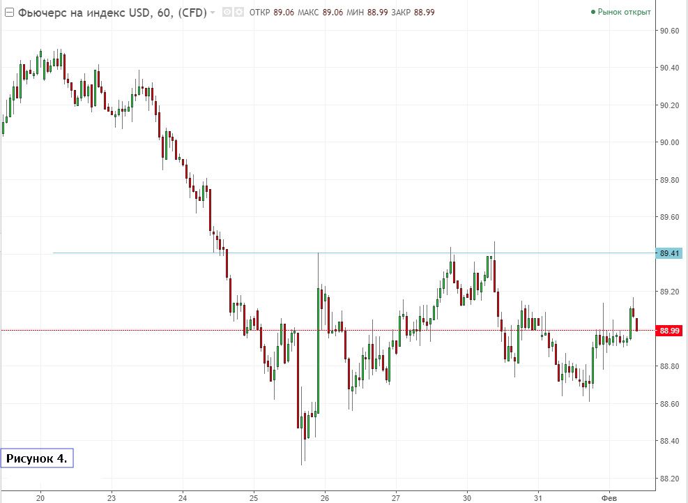 Более детально картина по индексу доллара видна на часовом графике с уровнем 89.4 и район 88.6.