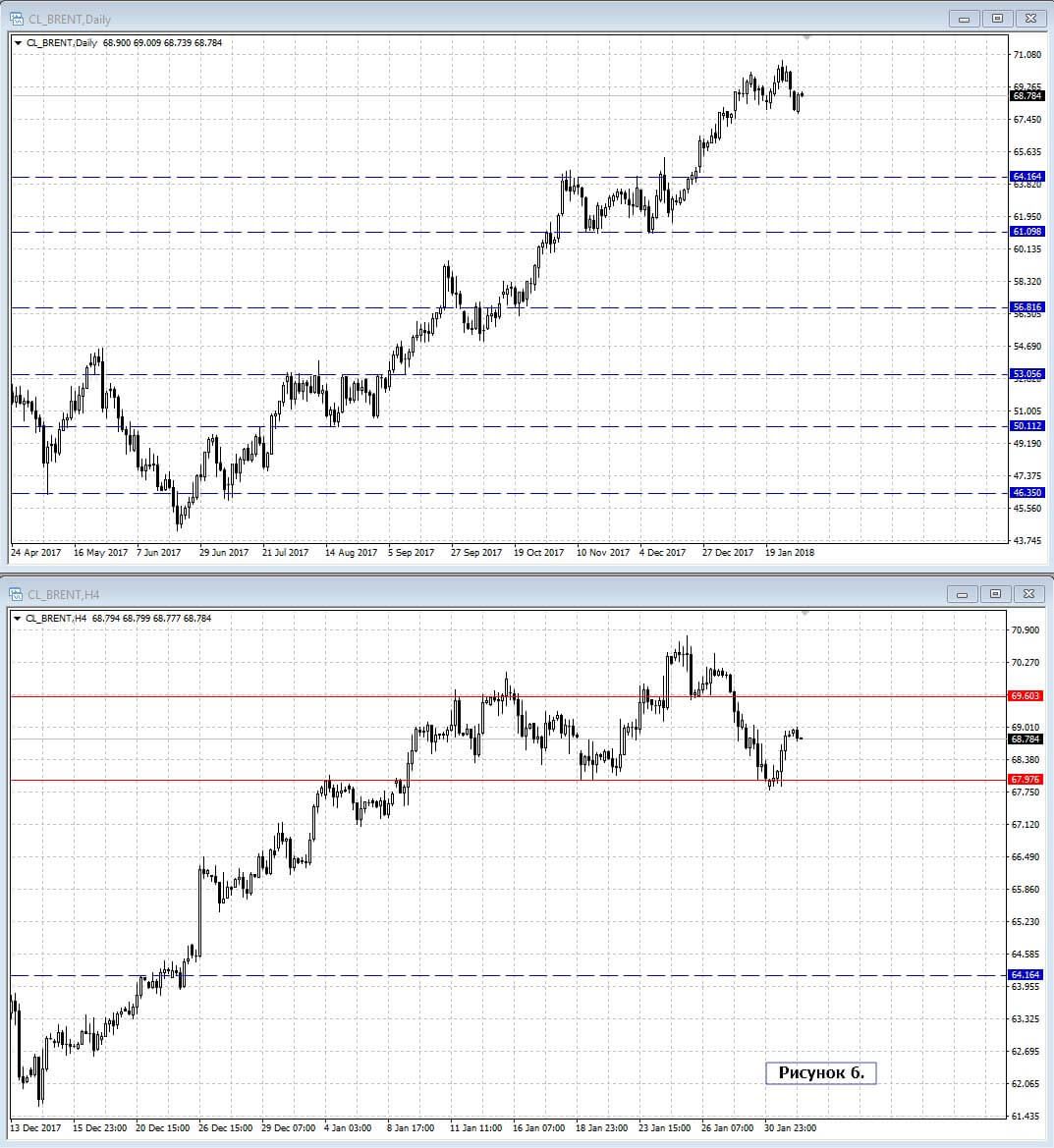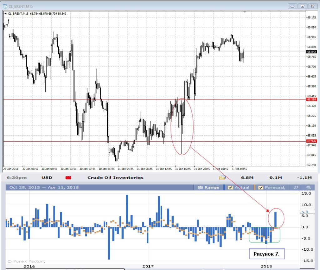 Чуть позже выходит негативный отчёт с увеличением запасов на складах. Но попытка пройти отметку 68 оказывается безуспешной, продавцы отступают и после пробоя 68.38 цена получает импульс и есть все шансы продолжить тренд.