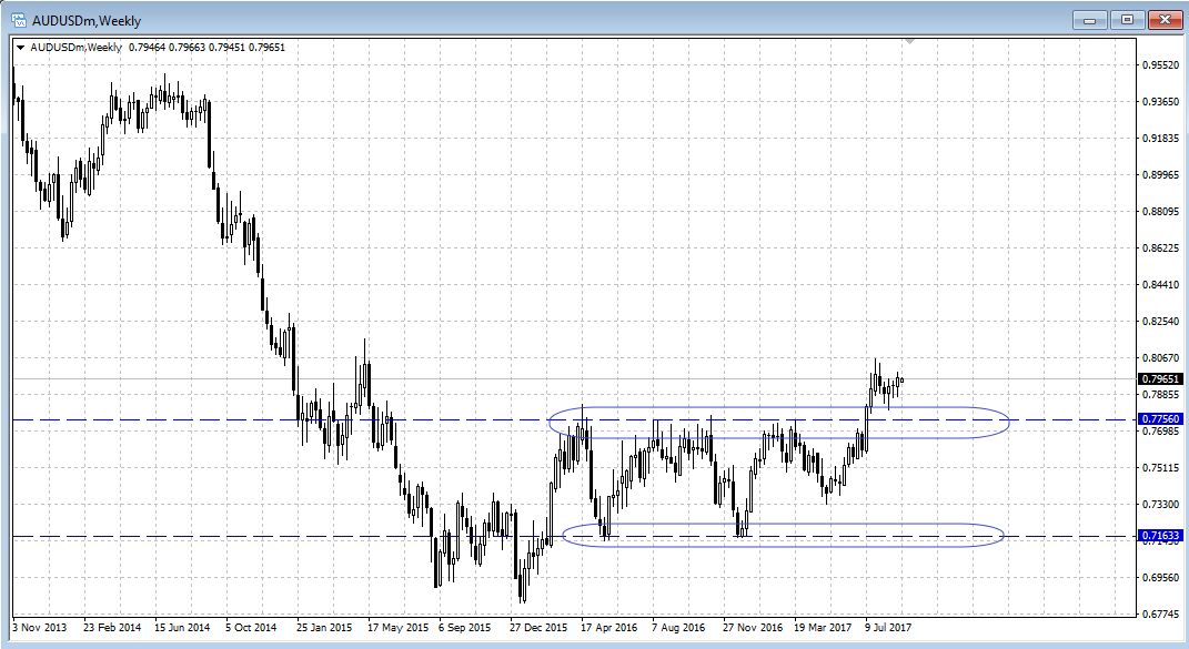 Австралийский доллар также ожидает интересная неделя. Технически в паре с долларом США валюты выше ключевого уровня сопротивления 0.775.
