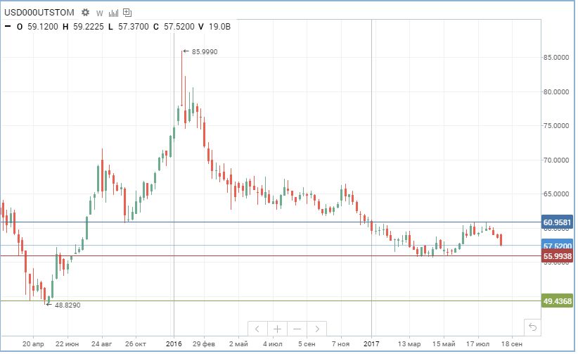 Российский рубль продолжает своё укрепление, начатое от уровня 61. Если не возникнет корреляционного препятствия по нефти с сильным негативом, а сейчас нефть марки Брент опять вплотную подошла к ключевой цене 53, то российская валюта может продолжить тренд к поддержке на отметке 56.