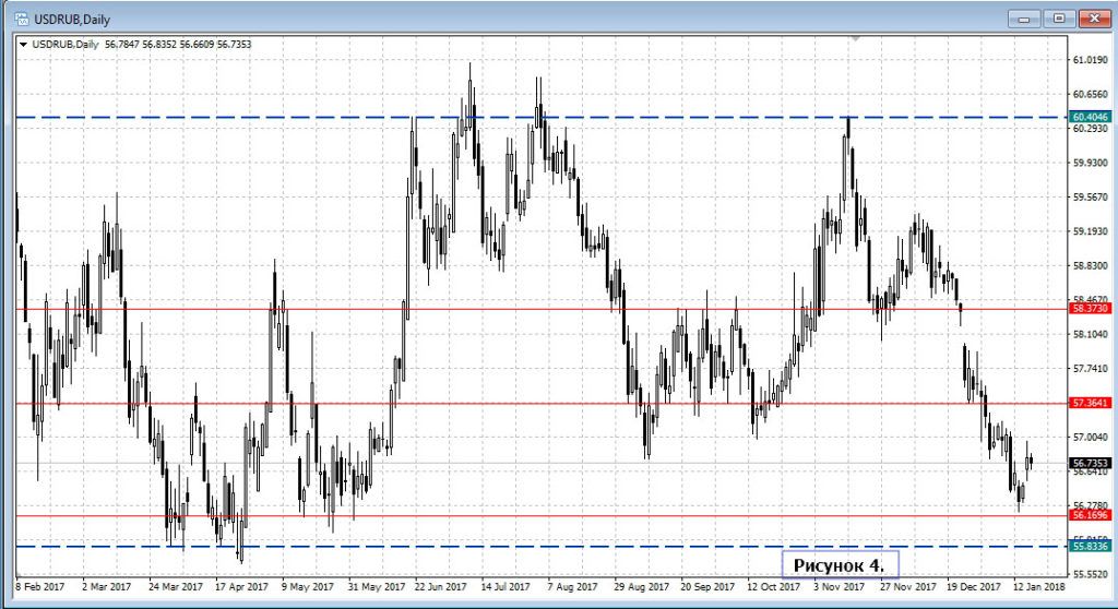 Пара российского рубля к доллару была затронута обзорами ранее и вероятности отскока от района 56 на фоне возможной коррекции по нефти.