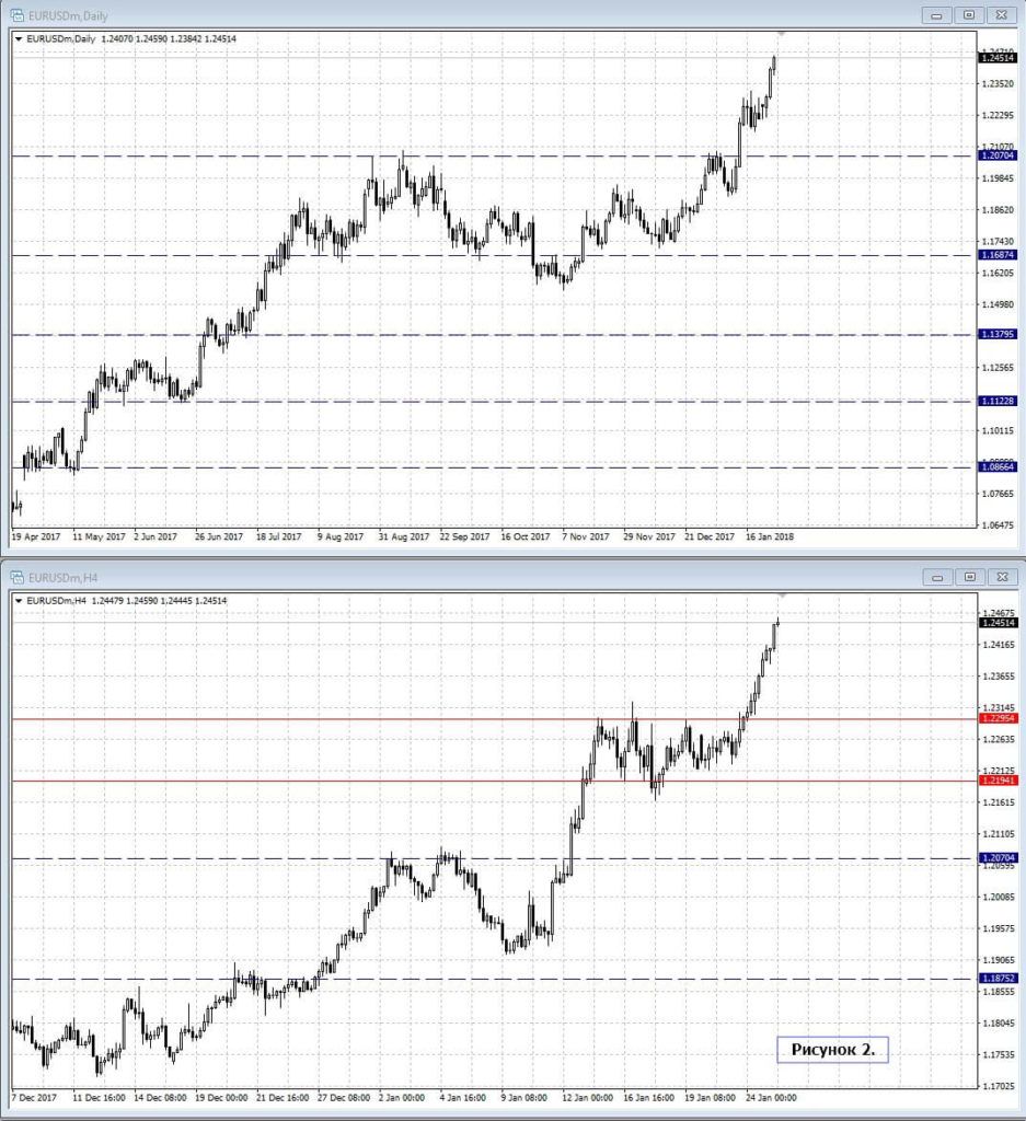 Евро к доллару после выхода из границ локального диапазона 1.22-1.23 продолжает трендовое движение.