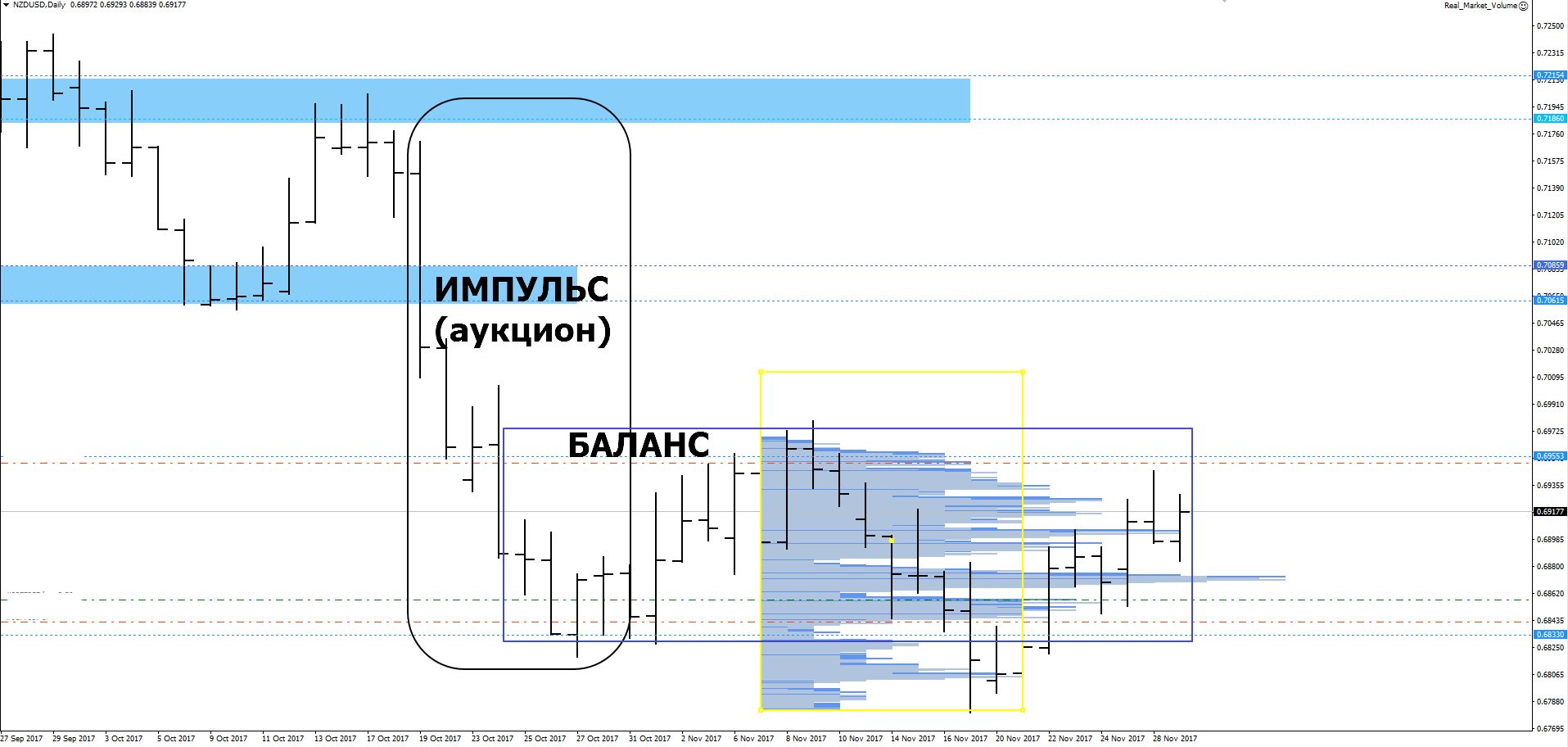 Последовательность баров, торгующихся в узком диапазоне, — это проторговка зоны стоимости. В такой ситуации рынок находится в состоянии баланса.