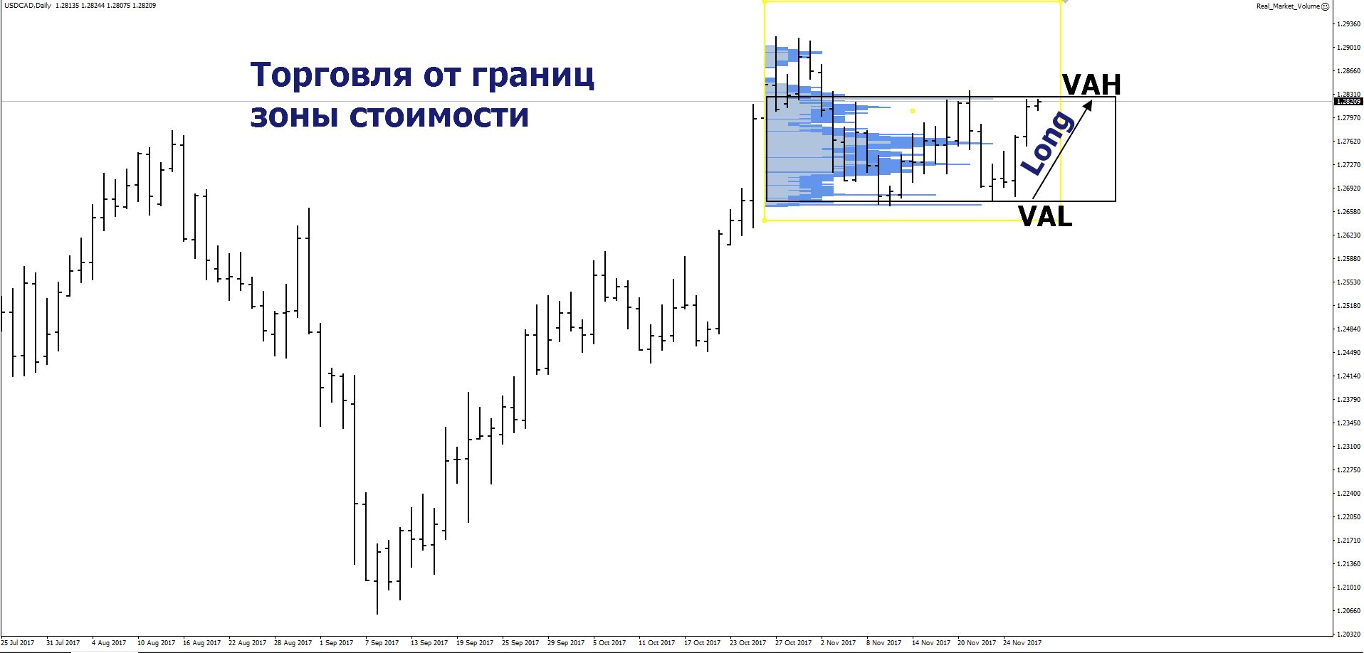 Что фактически это значит? Зона стоимости определяет ценовой диапазон, который устраивает большую часть участников торгов. В этой области происходит накопление объёмов, трейдеры набирают позиции, так как цена им кажется выгодной.
