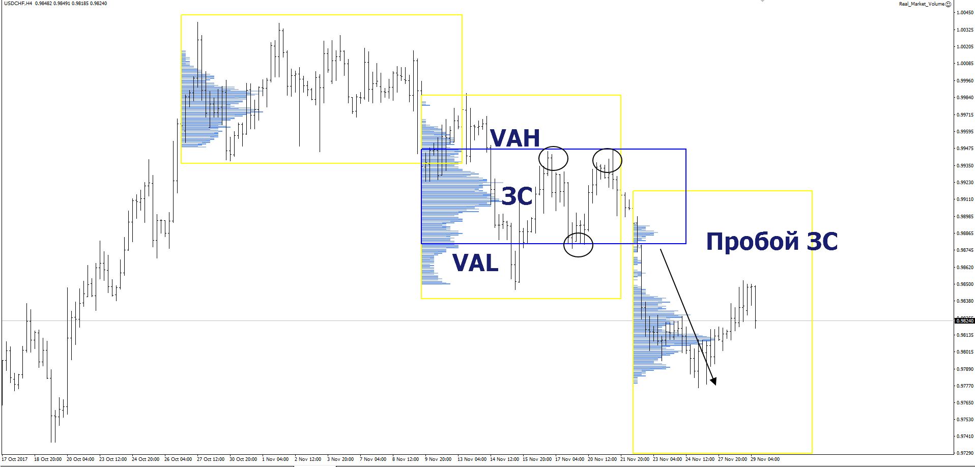 Пока идёт накопление объёмов внутри новой зоны стоимости, можно торговать от её границ.
