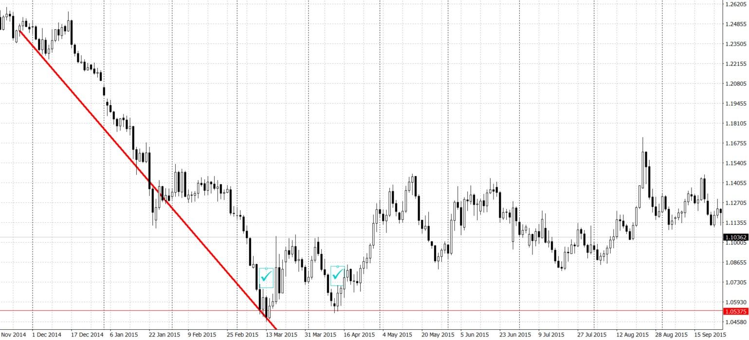На графике ниже галочками отмечена фигура «двойное дно». Как видим, данная фигура образовалась после длительно нисходящего тренда и говорит о его окончании и развороте рынка. Сигналом на вход в таком случае будет точка закрытия свечи завершающей фигуру.