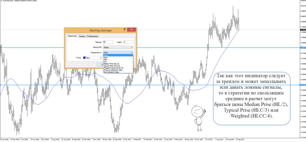 Так как этот индикатор следует за трендом и может запаздывать или давать ложные сигналы, то в стратегии по скользящим средним в расчет могут браться цены Median Prise (HL/2), Typical Prise (HLC/3) или Weighted (HLCC/4).