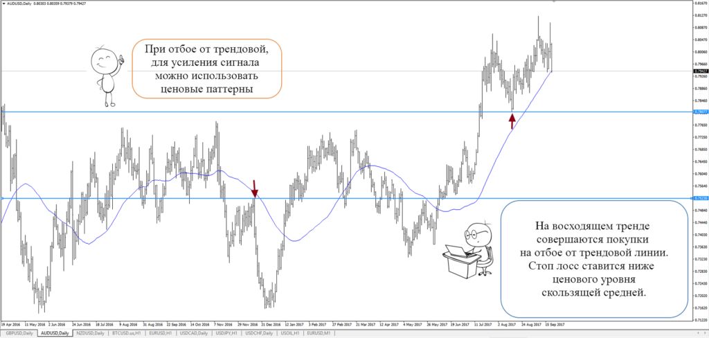 Если тренд направлен вверх и цена на откатах опускалась к скользящей средней и отбивалась от нее, то мы можем открывать сделки на покупку, выставляя стоп-лосс немного ниже данного ценового уровня.