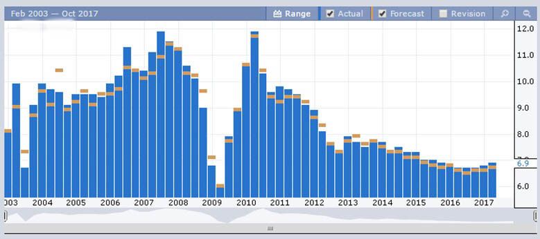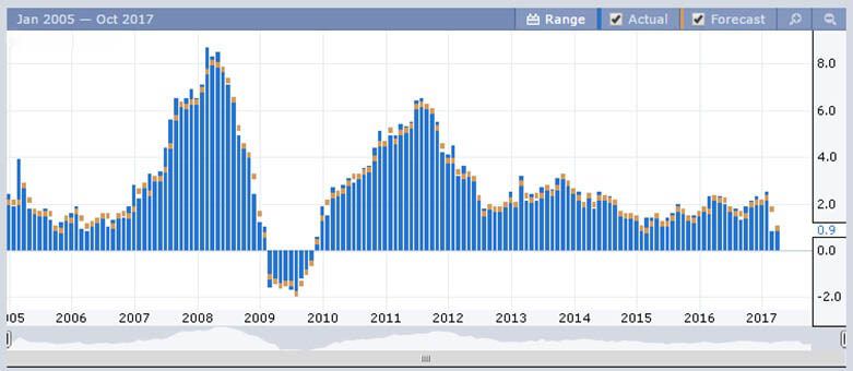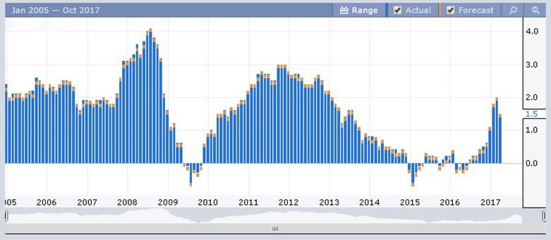Из рисунка видно, что кризису 2008 года сопутствовала значительная дефляция. Сейчас данные ежемесячно показывают колебания индекса от -0,5 до +0,5. Даже при уверенном росте экономики ФРС будет придерживаться крайне осторожной политики в повышении процентных ставок, пока сохраняются риски дефляции.