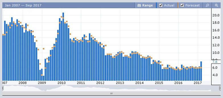 Некоторые из них упали, в т.ч. и ВВП – с рекордных 11-12 % до 7 %. Подобная ситуация наблюдается и в промышленном производстве: ранее оно показало прирост в 18 %, но за последние 4 года эта величина не превышает 8 %.