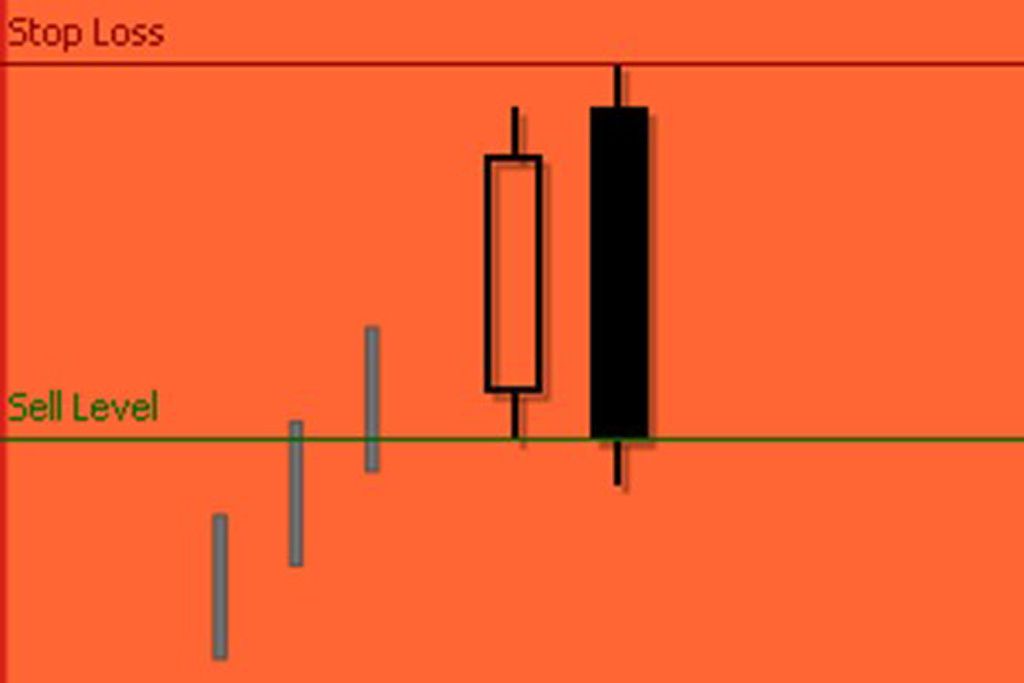 Такая фигура образовывается в случае, если за некрупной восходящей свечой образуется крупная нисходящая, целиком поглощающая меньшую свечу. То есть актив открывается выше стоимости, по которой закрылся днем ранее, а закрывается ниже стоимости, по которой открылся в предшествующий день.