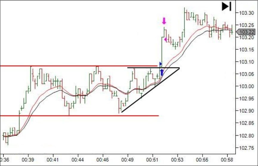 Иногда перед пробоем цена формирует графическую фигуру «треугольник», например восходящий, как на графике ниже. Здесь все довольно просто: открывать сделку надо тогда, когда паттерн будет близок к своему завершению.