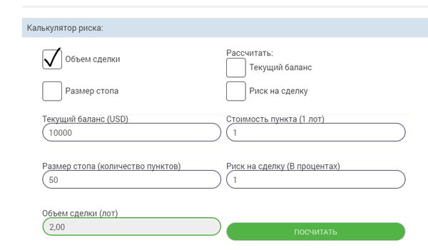 На следующем этапе определяем, сколько ордеров при риске на сделку в 2 % можно открыть одновременно, при расчетных значениях одного пункта и объема одной сделки. Для этого переходим к калькулятору риска.