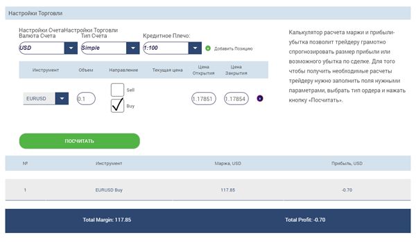 Выбираем пару ЕUR/USD, вводим размер лота 0.1 и получаем размер маржи $117.85.