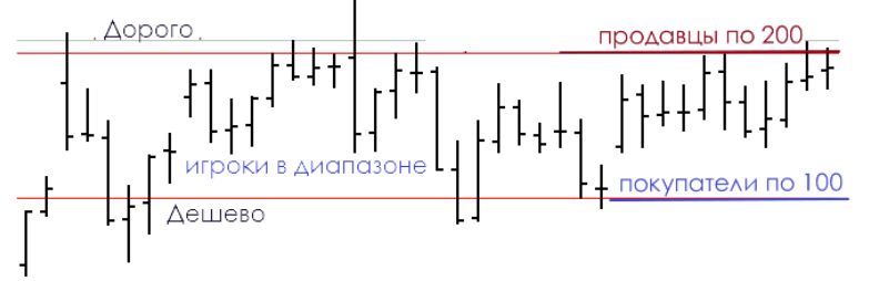 Предположим, у нас есть проторговка. То есть, рынок принял какую-то область цен на инструмент за справедливые цены. Игроки открывают короткие позиции на верхней границе диапазона, потому что на данный момент - это дорого для рынка, и покупают внизу диапазона, потому что, на данный момент, эта цена принята за дешевую.