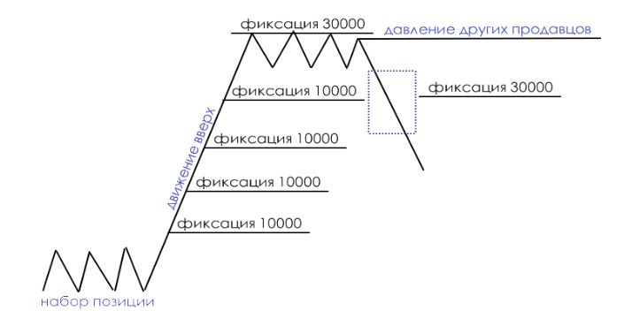Повышение цены в сторону игрока шло 5 дней, и часть он зафиксировал, но небольшими объемами. У него осталось 60 000 лотов и он держит этим объемом уровень (продает лимитным ордером, тейк-профит).