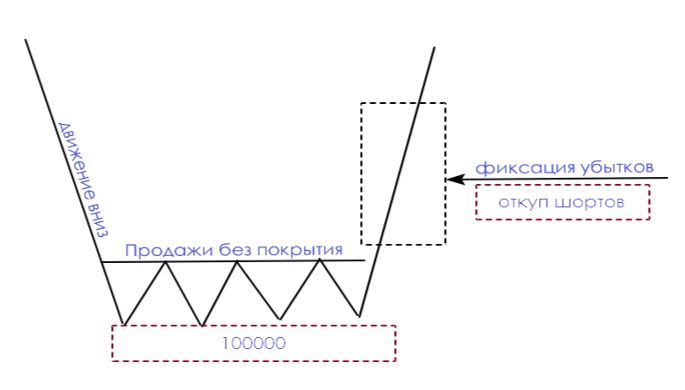 Почему? Потому то, что он продал, ему нужно вернуть брокеру, а это уже дорожает. Что будет делать этот продавец? Откуплять актив, конкурируя с покупателями за лучшие цены (начало рыночного аукциона). Что происходит? Импульс вверх! Посмотрим графически.