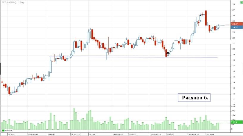 Вот ещё пример одного из ликвидных инструментов, где влияние гэпов также ограничено, — облигации TLT. И тоже сделка открыта на среднесрок и исполнена от фундамента к технике.