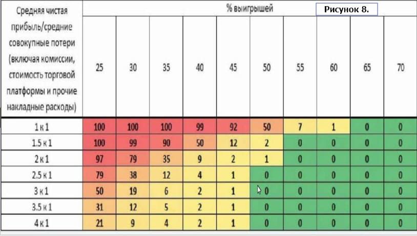 В таблице приведена вероятность обнуления торгового счёта в зависимости от процента положительных сделок и потенциала прибыли к риску.