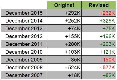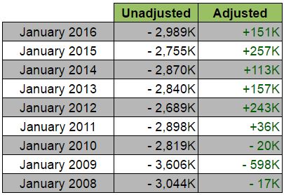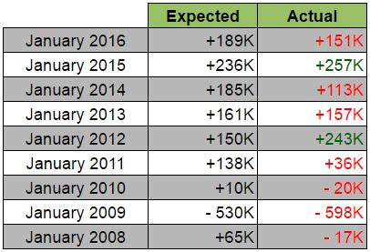 Если посмотреть на прошлые тенденции, в основном, экономика США терпит огромные потери рабочих мест в январе, поскольку компании избавляются от рабочих мест с неполной занятостью, связанных с праздничным периодом. Хотя, праздничные изменения означают, что показатели с учетом сезонных колебаний всегда выше и, в основном, достоверное число.