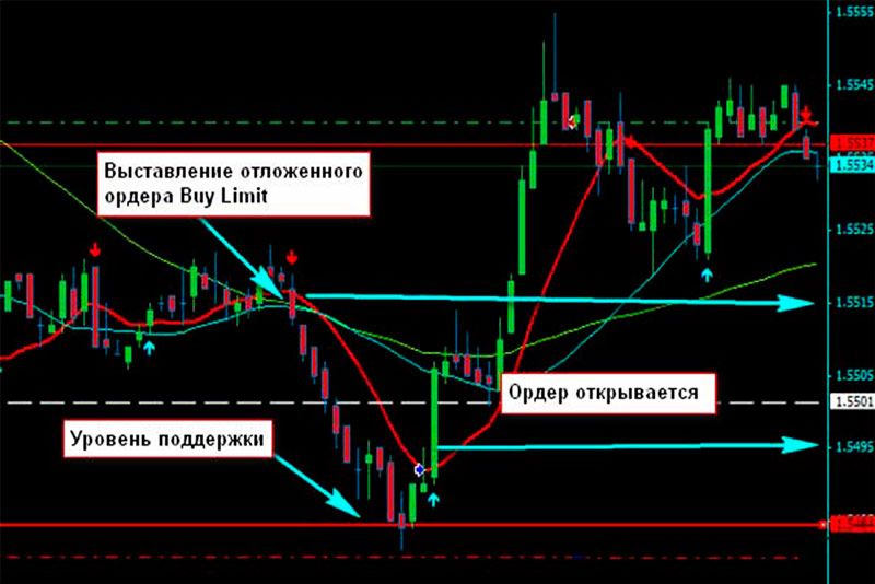 Например, при цене актива 1.5515 трейдер может открыть ордер Buy Limit с условием, что цена сначала дойдет до линии уровня поддержки (на цене 1. 5484), а потом отобьется от нее.