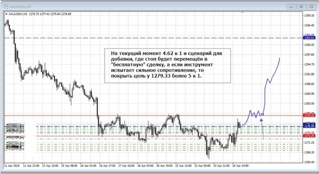 С учётом всех добавок и перемещённого стопа получаем мощную позицию и уже «бесплатную» сделку. Теперь сценарий — закрепление выше 1279.78 и добавка. А для тех, кто счёл бы достаточным потенциал 5 к 1, — уже.
