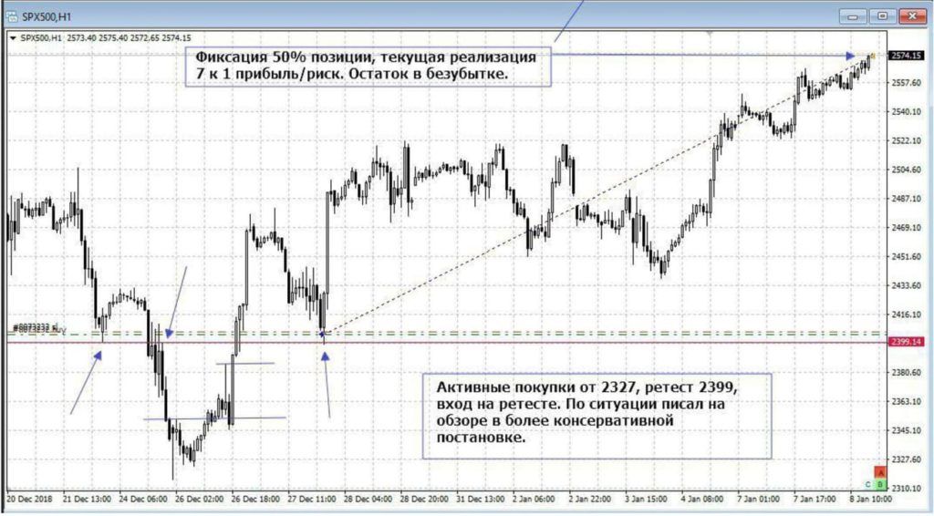 По итогу при минимальных рисках у нас появляется шанс сформировать солидную позицию. От пробы до расширения позиции, если всё складывается согласно ранее написанному сценарию.
