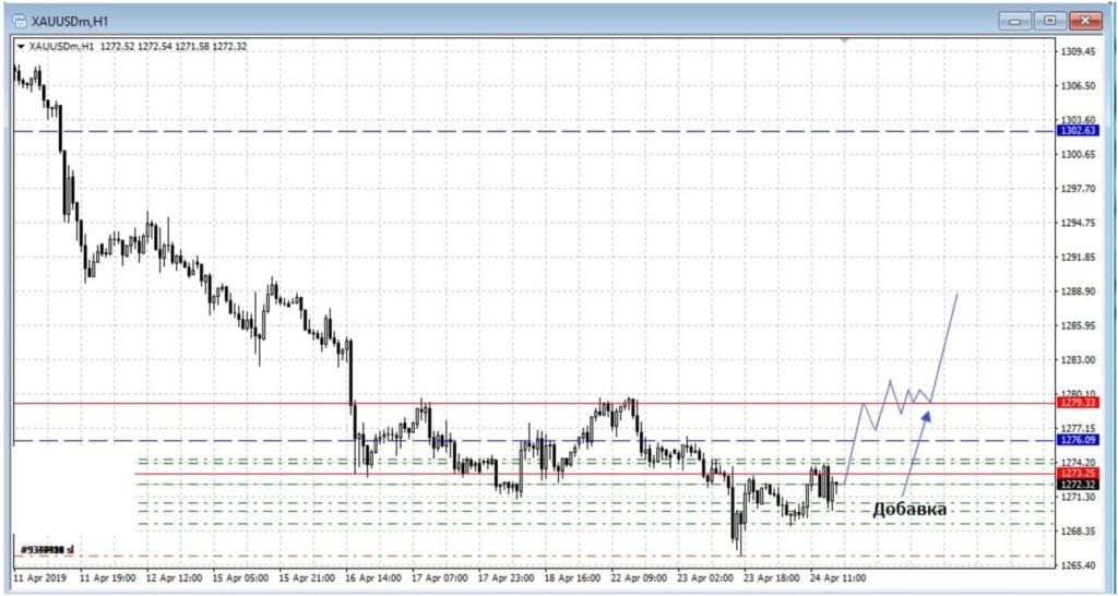 Это локальная позиция. По часовику добавка будет в случае пробоя по цене 1274.46. Если глобально идём и закрепляемся выше 1279.33, то буду ещё добавлять. Т.е. смотреть буду за тем, как проходит импульс и борьба за 1279.33.