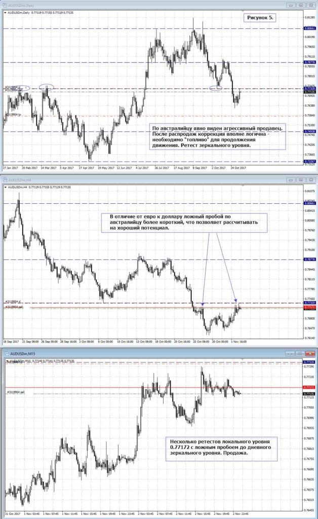 На рисунке 5 обоснования открытия сделки: инструмент обновляет очередной минимум, откатывается на ретест пройденной границы диапазона и двадцать часов не может пройти цену 0.77172 откуда уже были продажи.