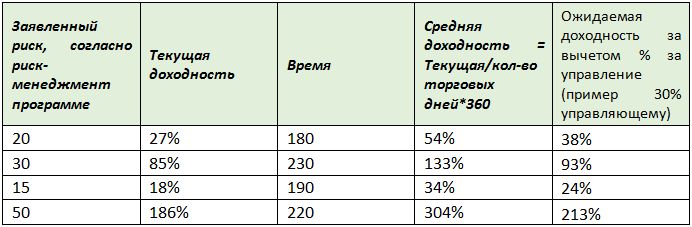 У каждого управляющего мы видим свою историческую доходность и заявленные риски. Чтобы получить ожидаемую годичную доходность, мы должны пересчитать текущую доходность на один день и умножить ее на количество дней в году.