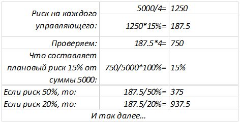 5000/4 = 1250. Именно такую сумму мы готовы инвестировать в одного управляющего. Но при этом из расчета на 1250 USD мы готовы к просадке лишь в 187,5 USD (15 %).